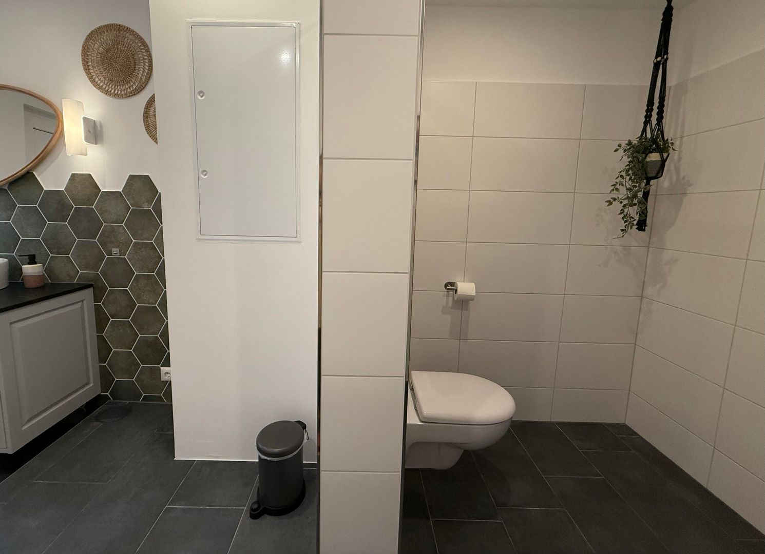 Das Badezimmer im Obergeschoss bietet eine geräumige Dusche, eine Badewanne und einen Einbauschrank. Ein Föhn ist ebenfalls vorhanden. Zusätzlich gibt es im Erdgeschoss einen Waschraum mit großzügigem Waschtisch und Toilette.