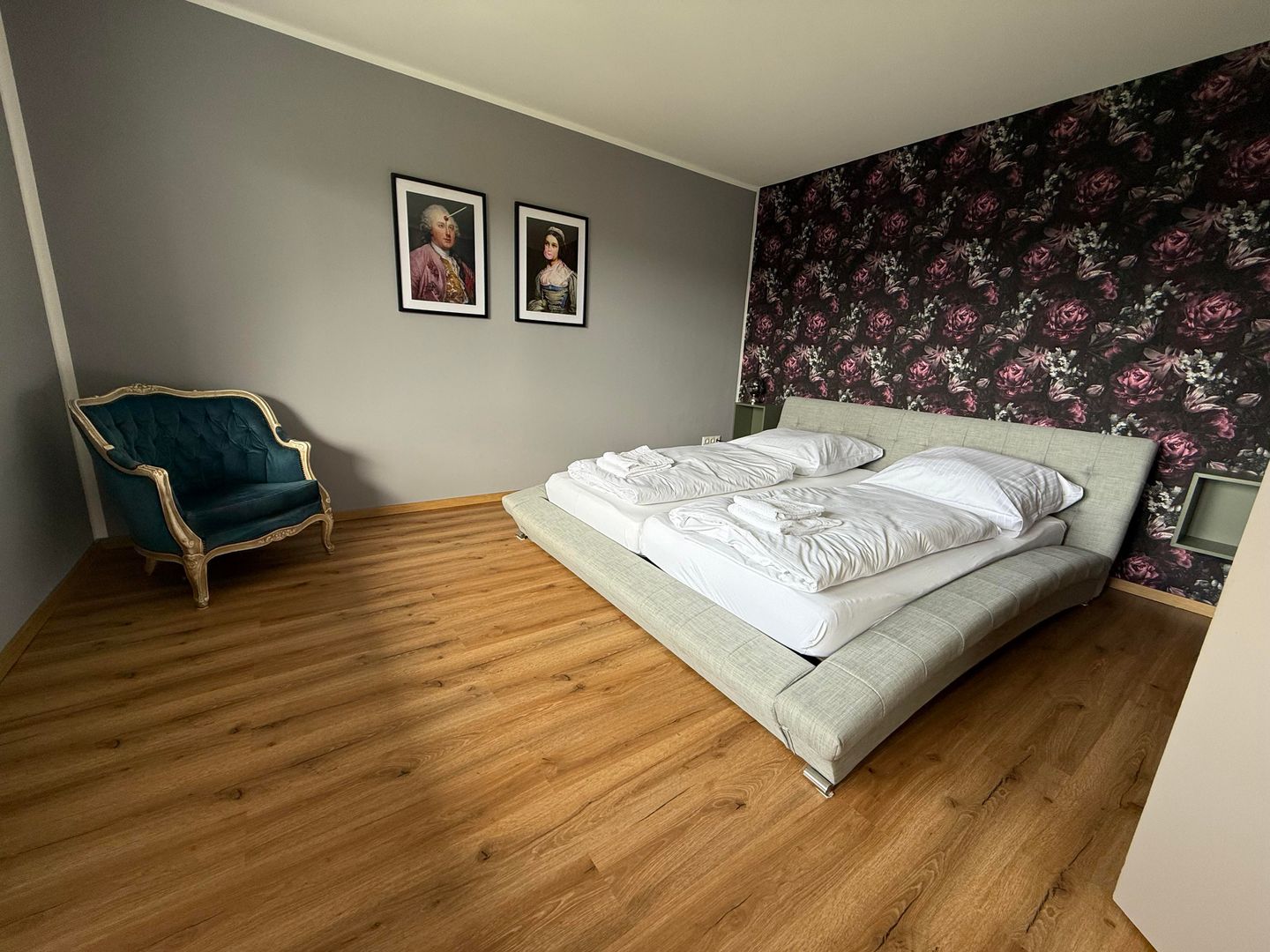 Im Obergeschoss befinden sich drei komfortable Schlafzimmer. Zwei Zimmer sind mit Doppelbetten ausgestattet und bieten einen herrlichen Blick ins Grüne. Das dritte Schlafzimmer verfügt über ein ausziehbares Bett. Alle Schlafzimmer sind mit Verdunklungsrollos ausgestattet.