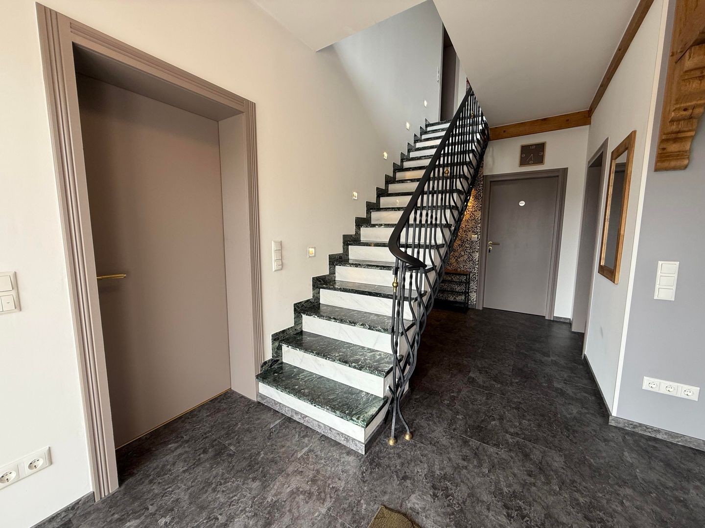 Vom oberen Flur aus gelangen Sie auf den großzügigen Balkon, der mit einem kleinen Tisch und zwei Sitzgelegenheiten ausgestattet ist. Hier können Sie die frische Luft und den Ausblick genießen.