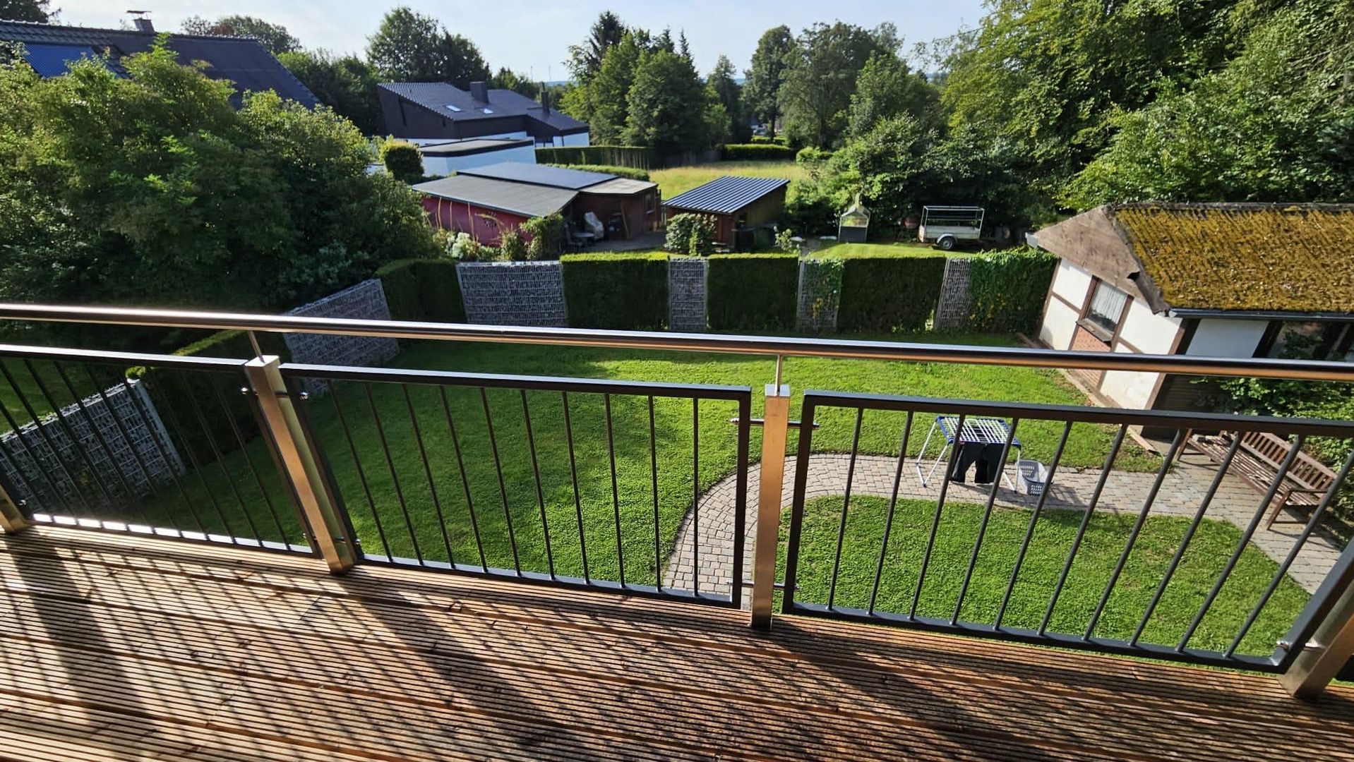 Der kleine Balkon ist ausgestattet mit Gartenmöbeln.