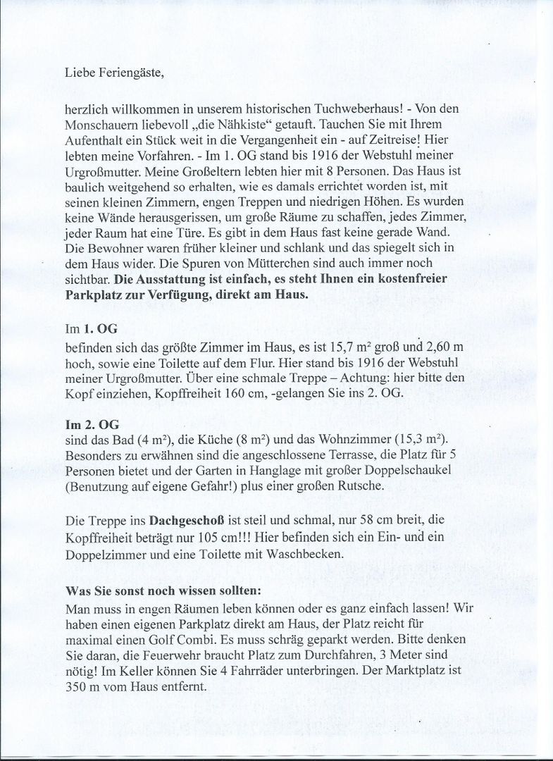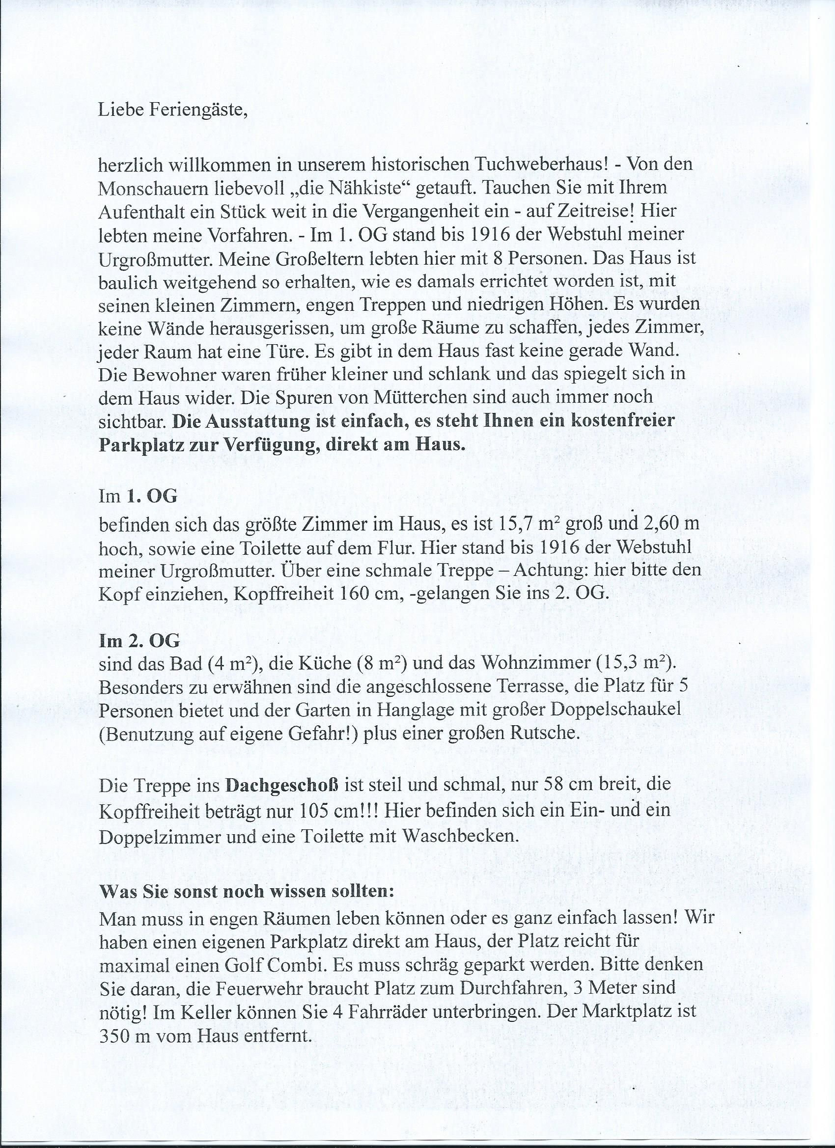 Typisches Tuchweber-Haus, unter Denkmalschutz stehend und im Stadtkern gelegen. Aussicht auf das Rote Haus, Burg, Haller. Zu Fuß erreichen Sie in ca. 2 Minuten die Bushaltestelle Parkhaus Laufenstraße, in ca. 3-5 Minuten den Marktplatz, in ca. 10 Minuten die Schwimmhalle und den Vennbahnradweg. Wir haben einen eigenen, kostenfreien Parkplatz!!! Die "Nähkiste" hat für maximal 5 Personen Platz. Es stehen zur Verfügung 1 Doppelzimmer mit Dusche im 1. OG und 1 Doppelzimmer und 1 Einzelzimmer im Dachgeschoss. Für die Zimmer des Dachgeschosses ist das Badezimmer im 2. OG. Die Gartenterasse und eine Doppelschaukel mit Rutschbahn stehen Ihnen auch zur Verfügung auf Höhe des 2. Obergeschosses.