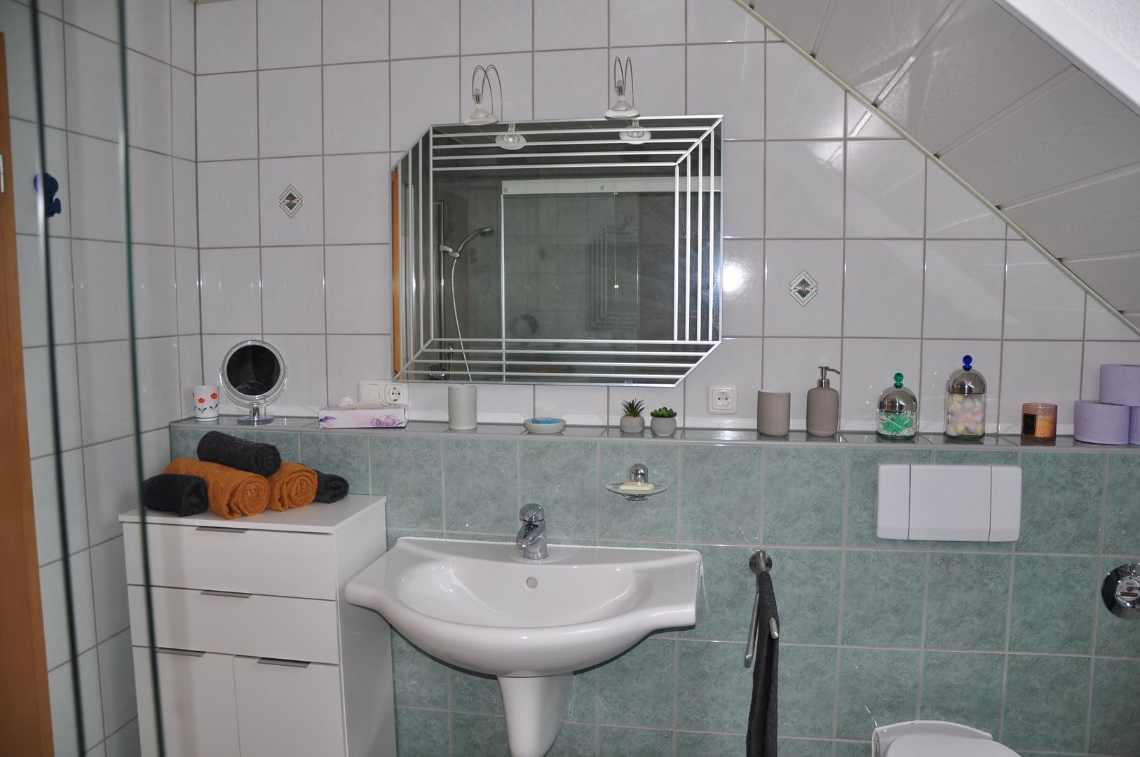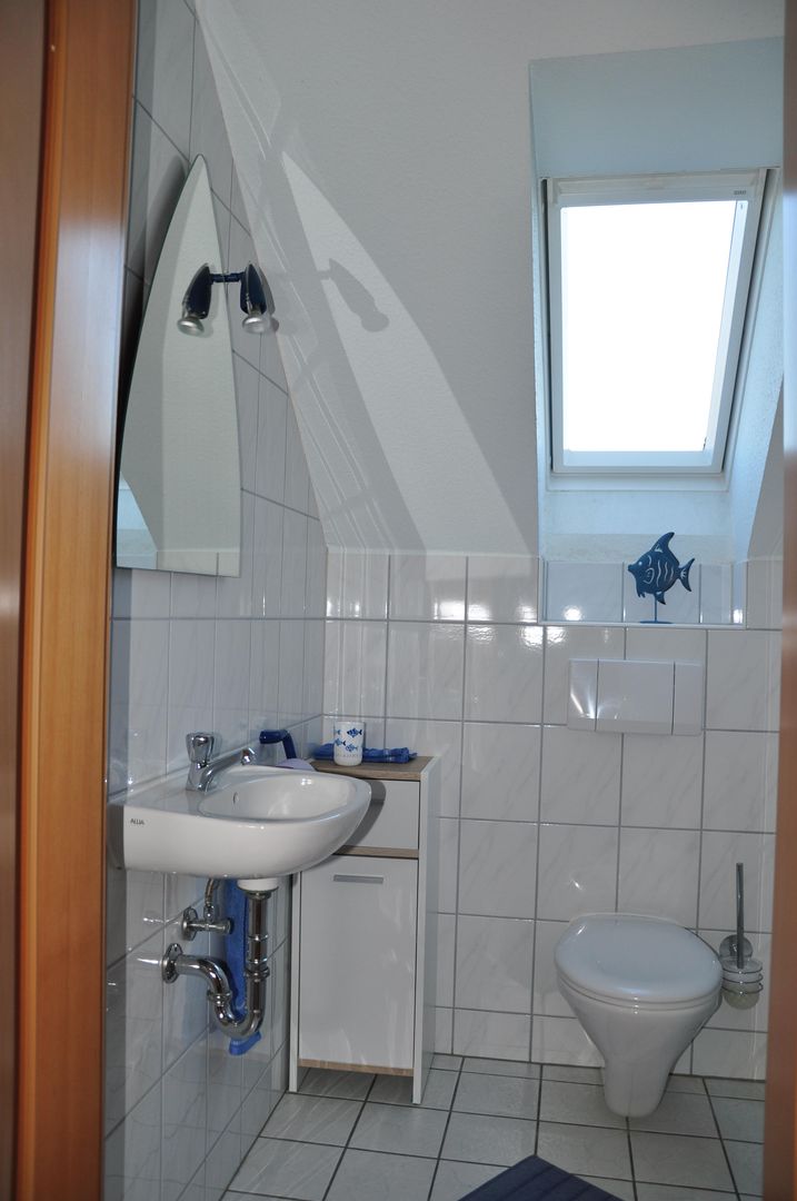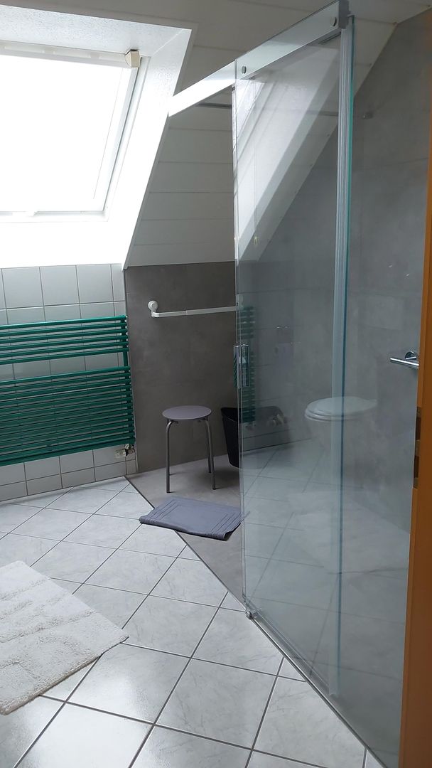 Das Tageslicht-Bad verfügt über eine ebenerdige Dusche, WC und Waschbecken. Weiterhin steht eine separates WC mit Waschbecken zur Verfügung.