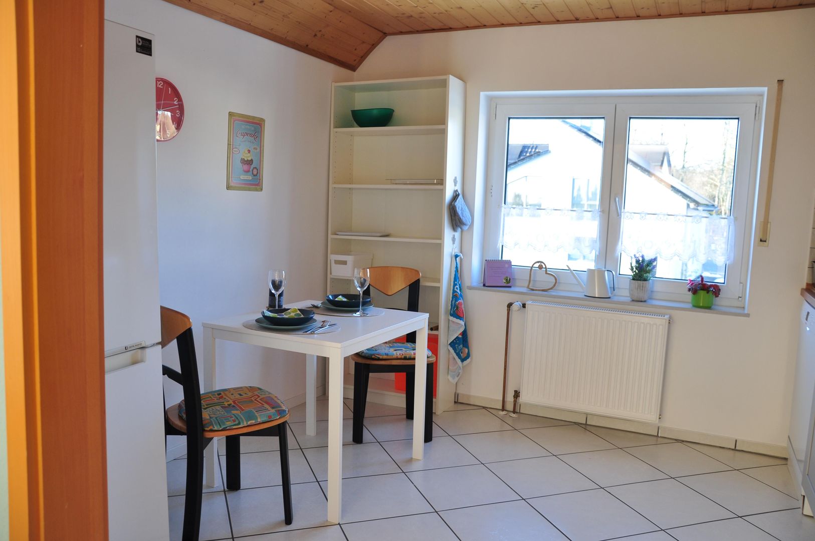 Die helle Küche bietet eine Spülmaschine, Backofen, Ceran-Kochfeld und einen Kühlschrank mit Gefrierfach.