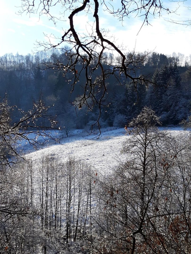 • Eine verschneite Landschaft mit schneebedeckten Feldern und Bäumen. Der Himmel ist klar und blau, was einen schönen Kontrast zur weißen Winterlandschaft bietet.