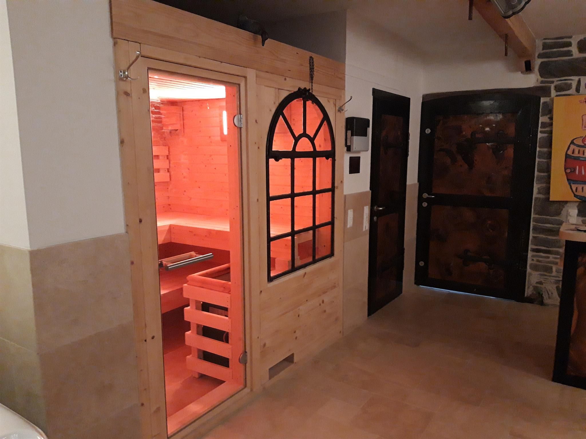 • Ein gemütlicher Raum mit einer Sauna und dunklen Türen. Die Sauna ist aus Holz und beleuchtet in einem warmen, roten Licht.