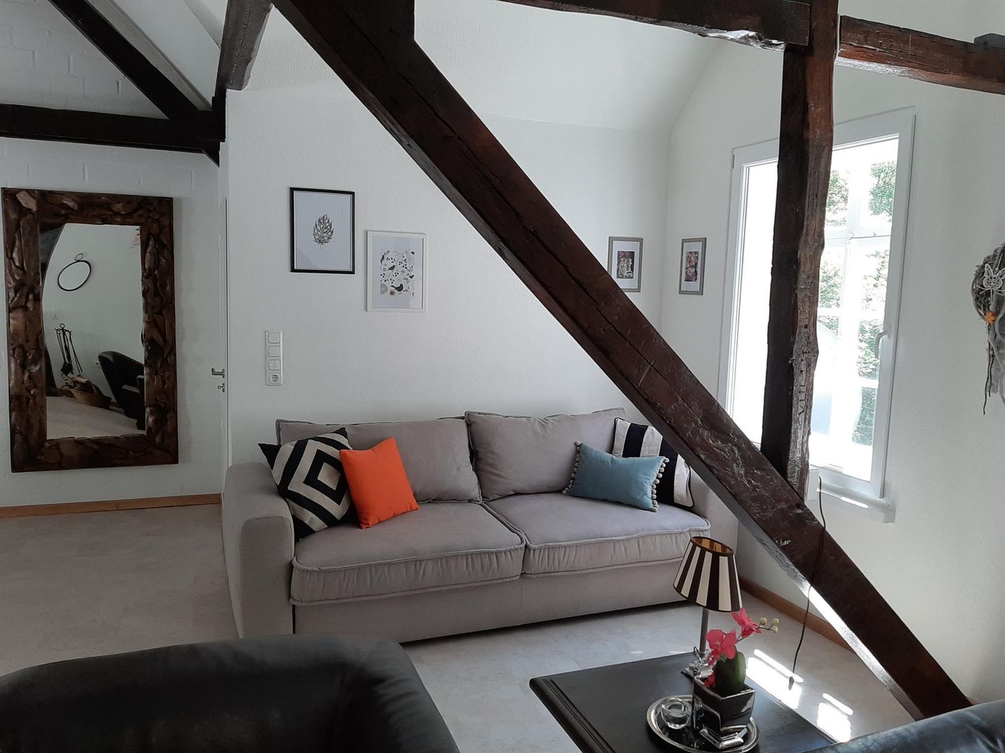 • Ein gemütliches Wohnzimmer mit einem grauen Sofa und bunten Kissen. Die Wände sind teilweise mit Holzrahmen dekoriert, und es gibt große Fenster, die viel Licht hereinlassen.