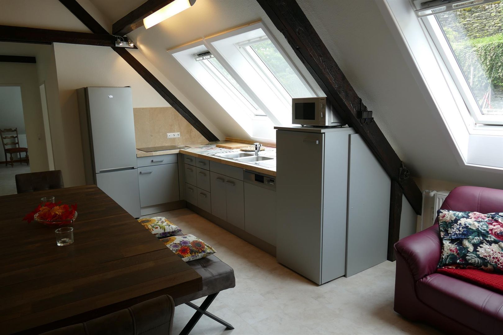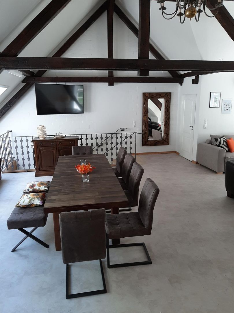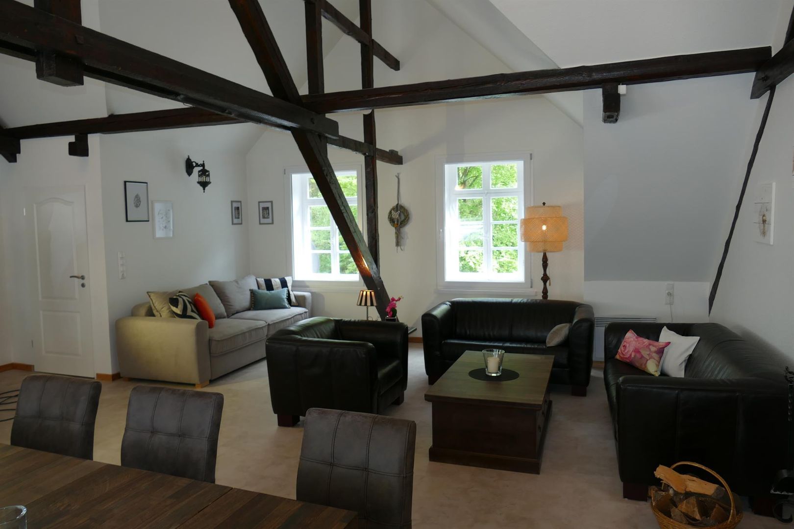 • Ein modernes Wohnzimmer mit Holzbalken und einer gemütlichen Sitzecke. Ein großer Tisch lädt zum Essen und Beisammensein ein.