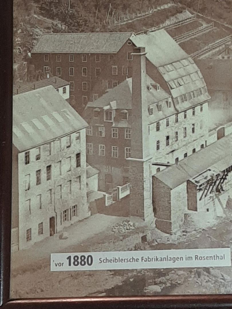 • Eine historische Fotografie von Fabrikgebäuden im Rosenthal vor 1880. Die Anlage zeigt mehrere Gebäude und einen hohen Schornstein.