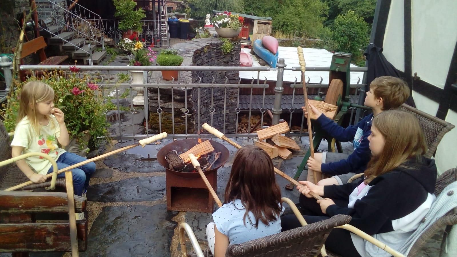 • Eine Gruppe von Kindern sitzt um ein Feuer, während sie Stockbrot zubereiten. Im Hintergrund sind Blumen und eine rustikale Landschaft zu sehen.