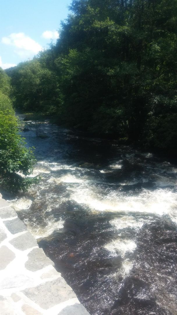 • Ein ruhiger Fluss mit schäumenden Wellen fließt durch eine grüne Landschaft. Verkäufliche Bäume umgeben das Gewässer und himmelblaue Stelle blitzen durch die Blätter.