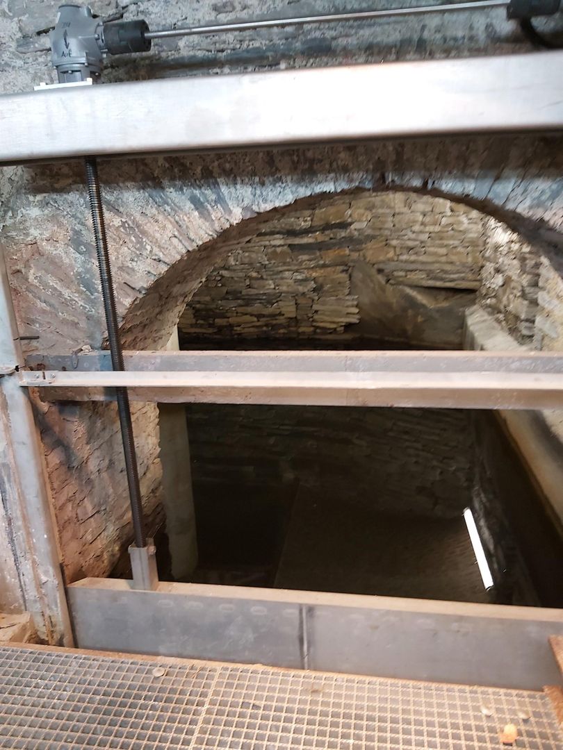 • Eine steinerne Öffnung mit einem Geländer, das in einen dunklen Raum führt. Es sind Wände aus Naturstein zu sehen.