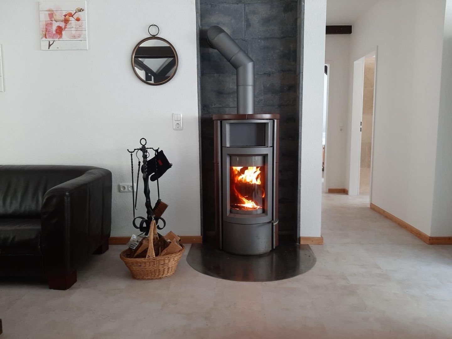• Ein moderner Kamin steht in einem hellen, gemütlichen Raum. Der Raum hat eine entspannende Atmosphäre mit einem bequemen Sofa und einem Korbwarenständer.