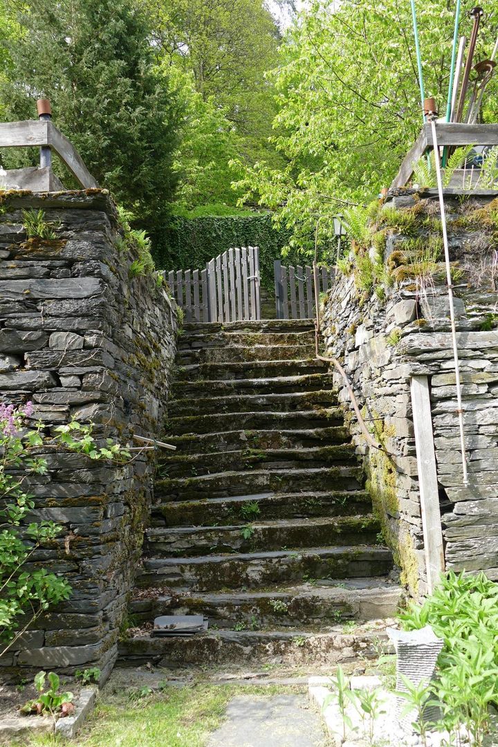 • Eine steinerne Treppe führt zu einem offenen Garten. Moos bedeckt einige Stufen, und im Hintergrund ist ein Holztor sichtbar.