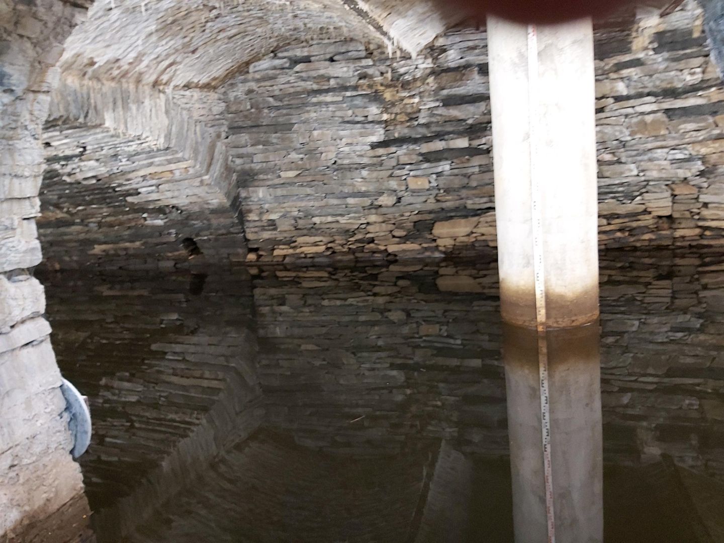 • Ein unterirdischer Raum mit steinernen Wänden und Wasseroberfläche. Ein Säulenständer steht in der Mitte und reflektiert sich im Wasser.