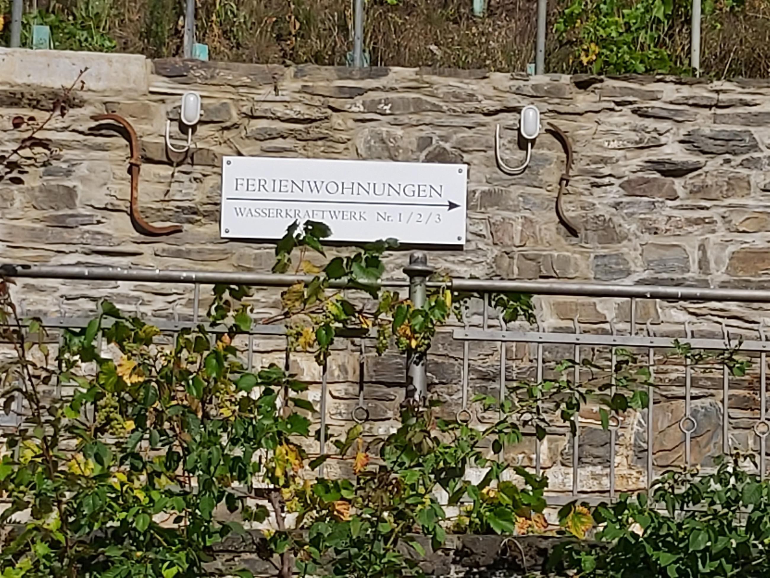• Ein Schild mit der Aufschrift "Ferienwohnungen" an einer Steinmauer. Es gibt Pflanzen und eine Richtungspfeil, der auf eine Unterkunft hinweist.