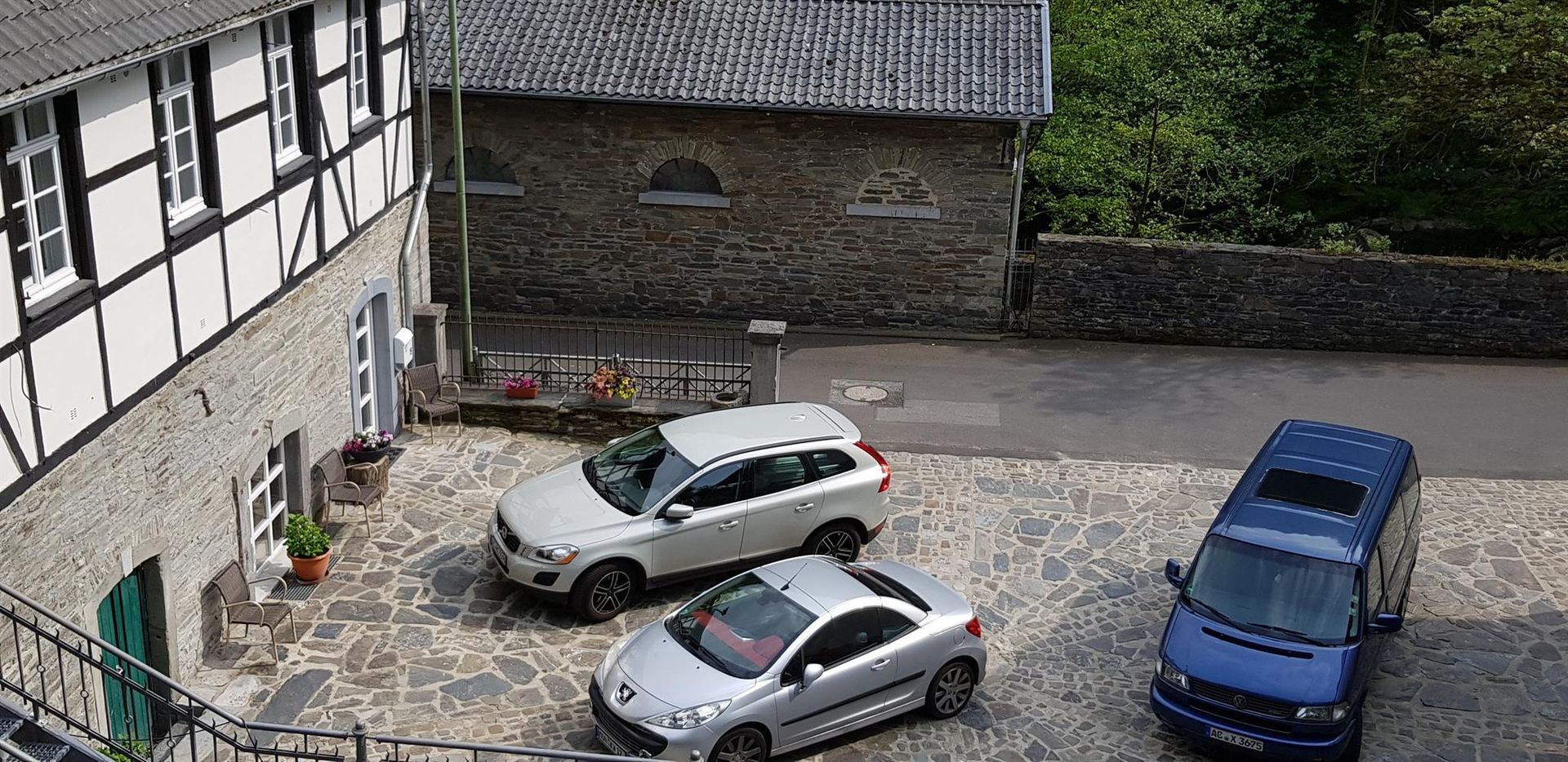 • Ein gepflasterter Innenhof mit drei Autos und einem historischen Gebäude im Hintergrund. Die Umgebung ist grün und ruhig.