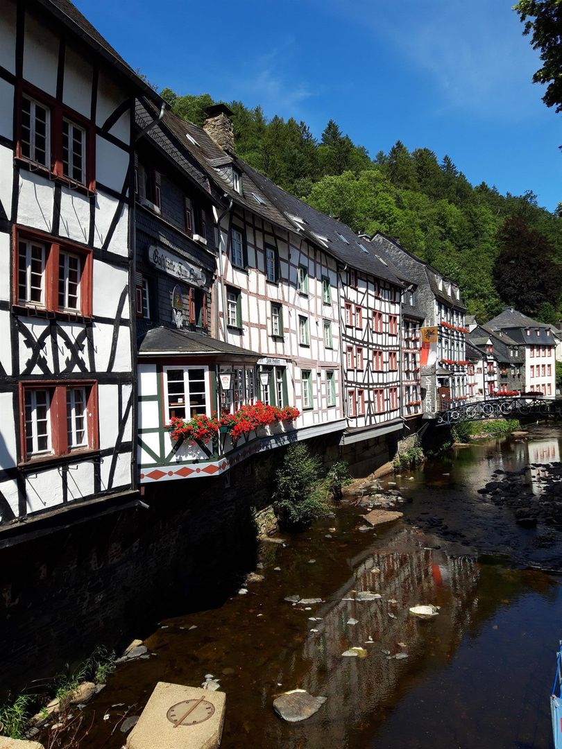 • Ein malerisches Fachwerkhaus am Ufer eines ruhigen Gewässers. Im Hintergrund sind grüne Bäume und ein blauer Himmel zu sehen.