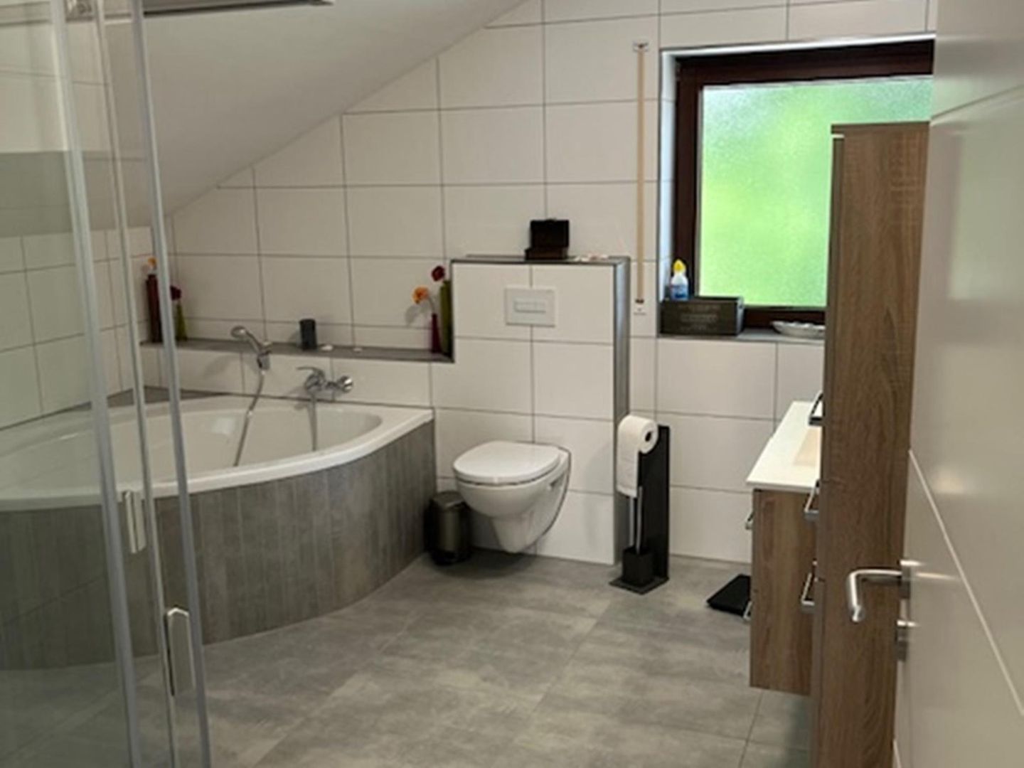 Das Bad ist ausgestattet mit einer Dusche, einer Badewanne, WC und einem Waschbecken sowie einer Waschmaschine und einem Trockner.
