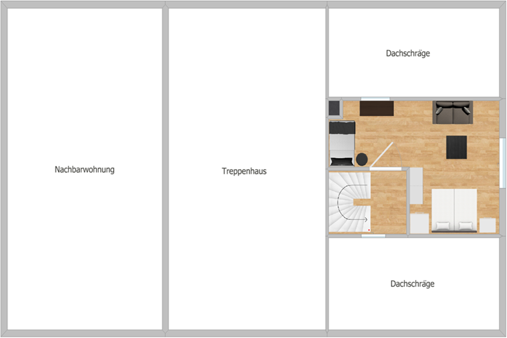 Im Schlafbereich gibt es zwei Doppelzimmer und ein Dreibettzimmer. Auf einer offenen Empore kann zusätzlich ein Klappbett aufgestellt werden.