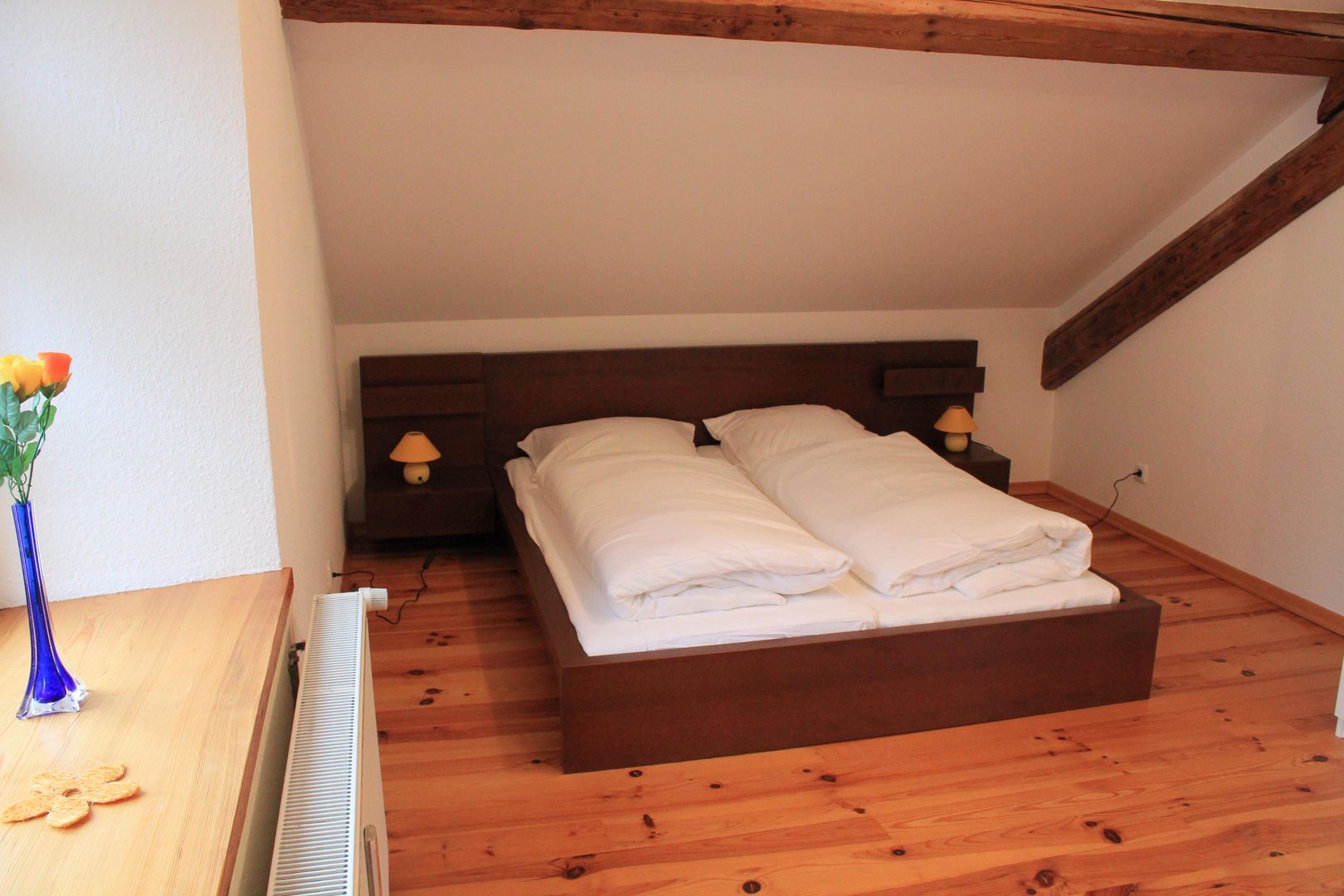 Die Räume sind großzügig und hell. Die teilweise frei liegenden Dachbalken