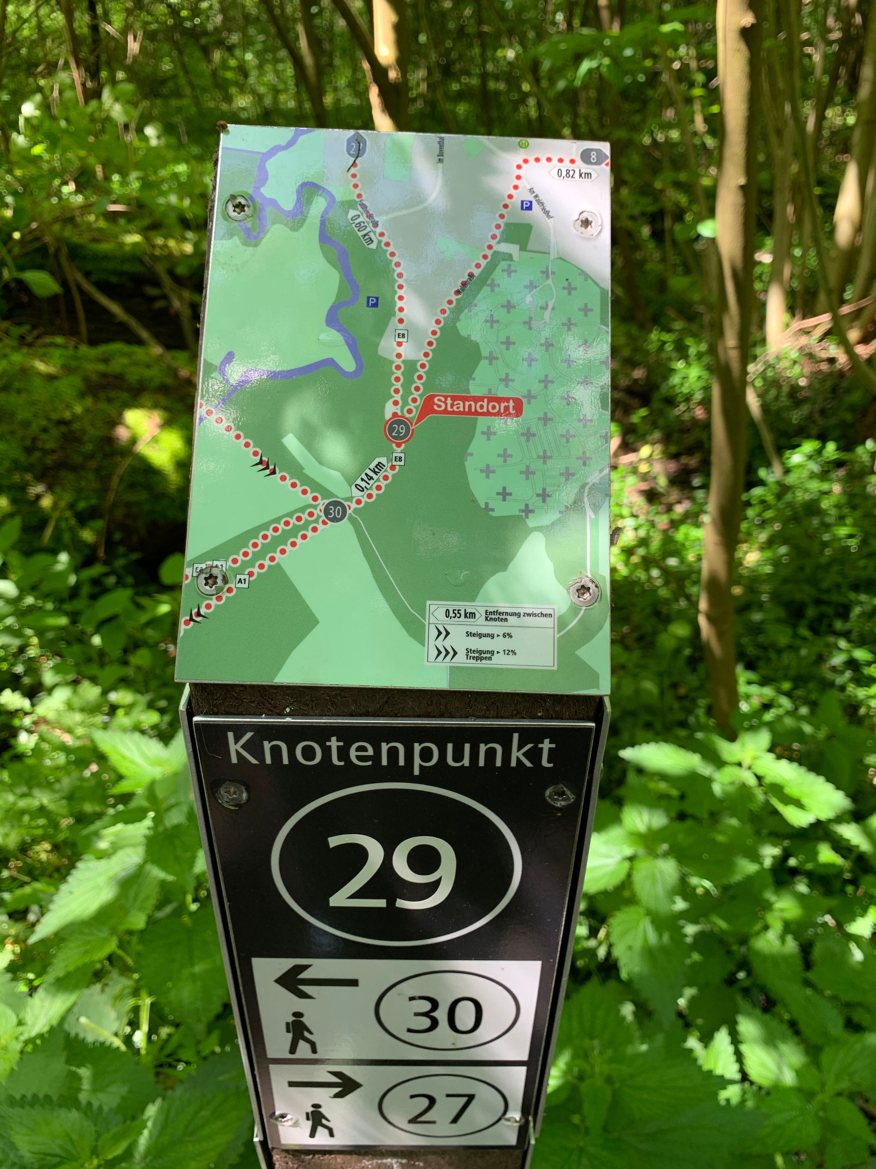 An den Kreuzungen der Wanderwege, den sogenannten Knotenpunkten, sind Pfosten mit Wegweisern und Orientierungskarte installiert. Die Nummer des Knotenpunkts, an dem du bist, steht ganz oben auf schwarzem Grund. Die Nummern auf weißem Grund weisen den Weg zu den nächsten Knotenpunkten. Sie sind auch an Abzweigungen unterwegs zu finden. An einigen Knotenpunkten findest du Stahlstangen mit Namen und Kilometerangaben mit wichtigen Zielen. Auch hier steht die Knotenpunktnummer ganz oben auf schwarzem Grund. Die weißen Plaketten mit den benachbarten Knotennummern sind unterhalb der Richtungsschilder befestigt.